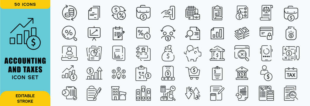 Accounting icon set. Containing financial statement, accountant, financial audit, invoice, tax calculator, business firm, tax return, income and balance sheet icons. Solid icon collection.