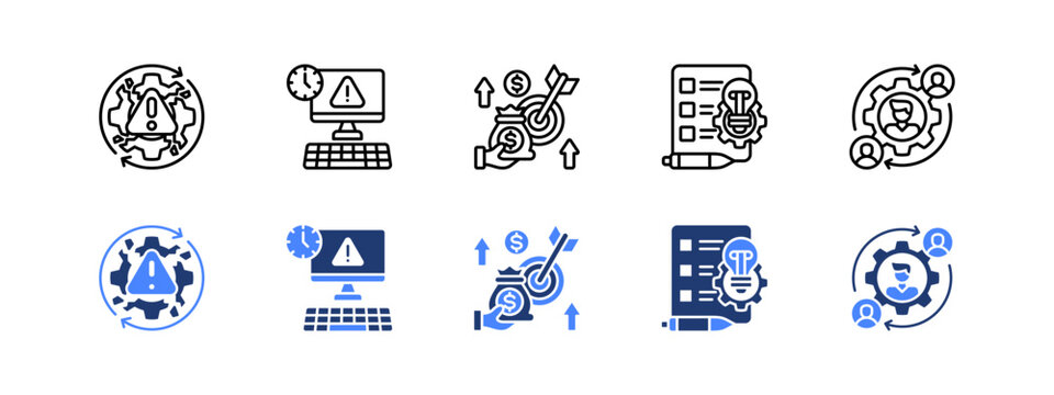 Inefficiency, Outdated, Limited funds, Quality issues, Turnover with two styles, line and duotone icon.