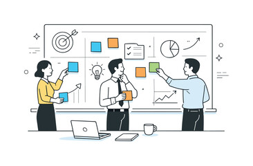 Business Strategy Mapping. Strategic business planning. Professionals mapping objectives on a board with cards and simple charts, focused and thoughtful