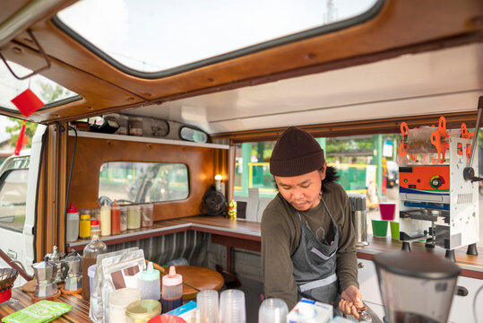 Cafe owner turning open door sign at entrance to show, greet and welcome people into local restaurant. Smiling, happy and friendly waiter opening bar and getting ready to serve or start a work shift