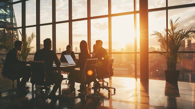 A group of business professionals gathered in a boardroom with glass walls, depicted in the style of double exposure photography against a white background.