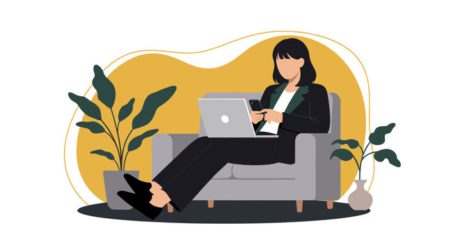 Professional woman working remotely on laptop and smartphone from a comfortable home office or lounge area, emphasizing modern work flexibility and connectivity.