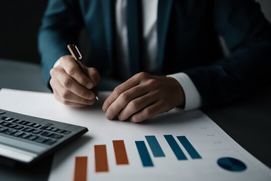A business professional analyzes financial data, writing insights on a report while using a calculator, exemplifying corporate diligence and strategy.