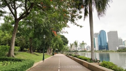 Benchakitti Park in Bangkok. Nearby, the skyscrapers of the business district are visible. A place of relaxation for residents, with a path around green areas. Skyscrapers, Urban park, Cityscape.