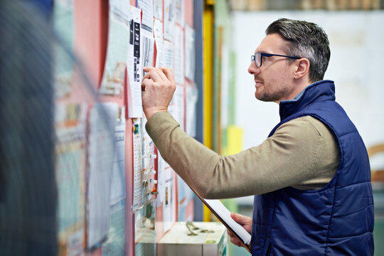 Man, business and board for planning schedule or calendar for shipping details, supplier information and warehouse. Male person, clipboard and notes for orders or inventory, poster and distribution