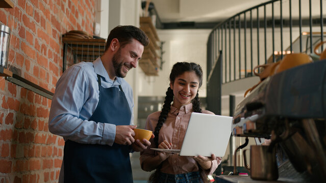Diverse positive man woman cafeteria employees small business owners cafe manager waiter discussing working schedule on laptop developing new strategy talking about work plan restaurant staff meeting