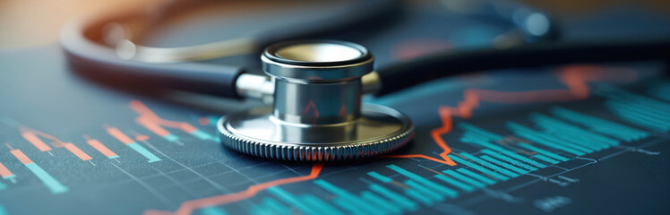 Stethoscope placed on financial chart represents healthcare market trends, analysis. Concept of industry growth, investment in medical sector, economy, health. Medical innovation, technology