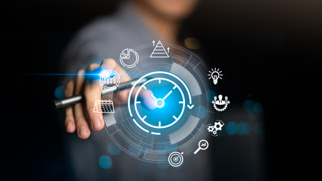 Business professional working on a laptop with clock and to do list interface, time management and productivity tools. Symbolizing task planning, scheduling, and efficient business workflow solutions.