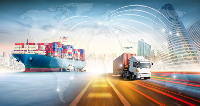 Global business logistics import export and container cargo freight ship, cargo plane, container truck on highway at city background with world map screen connections, transportation industry concept