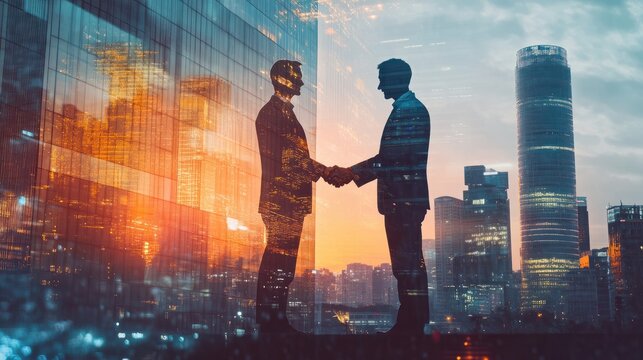 Double exposure image of business people handshake on city office building in background showing partnership success of business deal. Concept of corporate teamwork, trust partner and work agreement.