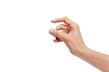 Woman's  hand showing credit card, or card, or business card or voucher, isolated on white background, template, mock-up