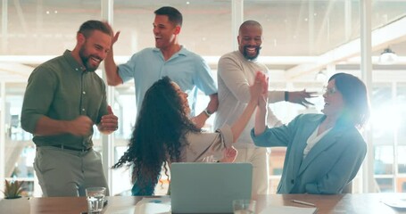 Winner, teamwork and business people on laptop with success, stock trading profit and financial bonus. Winning, celebration and happy workers cheer, high five and applause for sales goal on computer