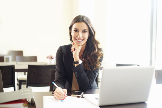 Shot of an attractive young woman sitting at her workstation in the office. The commercial designs displayed in this image represent a simulation of a real product and have been changed or altered