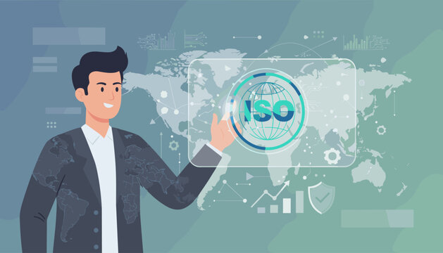 A smiling businessman in a suit adorned with a world map pattern interacts with a holographic interface displaying the ISO logo, symbolizing global quality standards, assurance, and international
