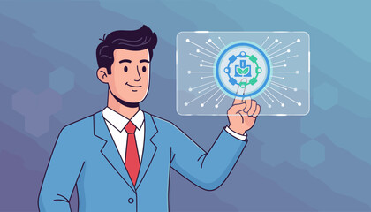 Business-to-business marketing concept illustration: A smiling businessman in a suit interacts with a digital interface, showcasing a network of business connections, handshake icons, and a shopping