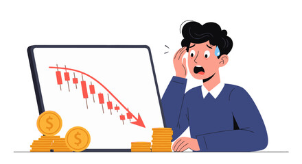 Stressed businessman panics over falling stock market chart and dwindling coins