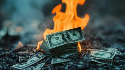 Close-up of burning stack of dollar banknotes with flames rising, symbolizing financial crisis, economic loss, bankruptcy, corruption, risk, greed, downfall, collapse, danger, illegal dramatic concept