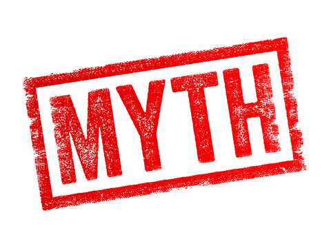 Red balloon with the word myth about to be popped by hand holding needle, concept of myth busting, truth revelation, false belief exposure, debunking, critical thinking visual