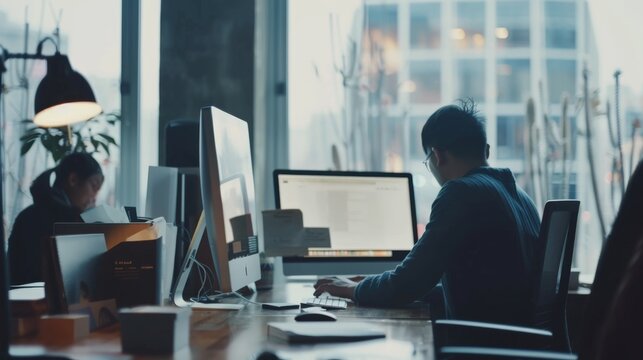 A dedicated individual works at a computer in an urban office, surrounded by the hustle and bustle of a modern cityscape through large windows.