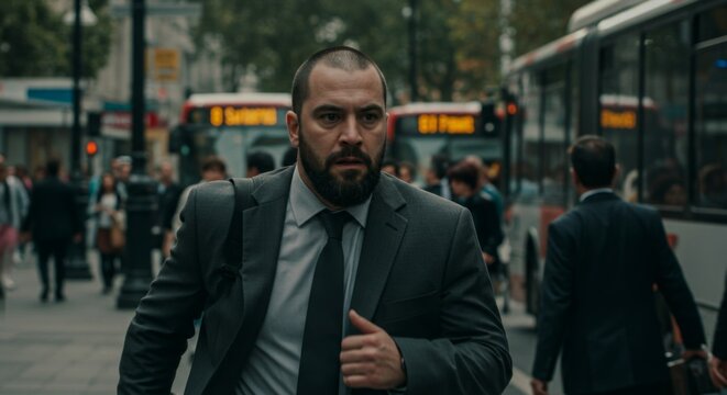 Man in suit running on city street. Business professional rushing or late. Urban hustle and bustle with focused expression.