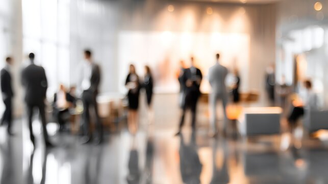 Blurred abstract office lobby scene depicting bustling business environment with people walking around and reflecting surfaces showcasing modern design.