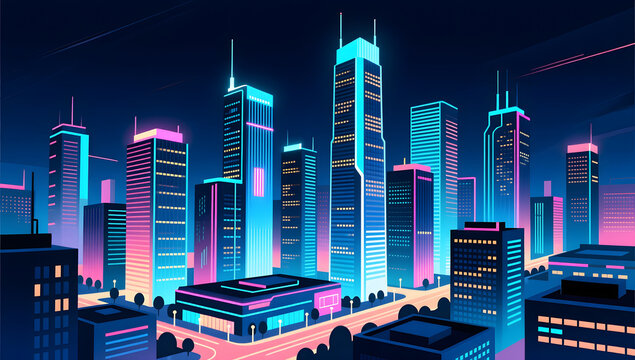 A cityscape with a group of people working in an office building. Scene is busy and bustling