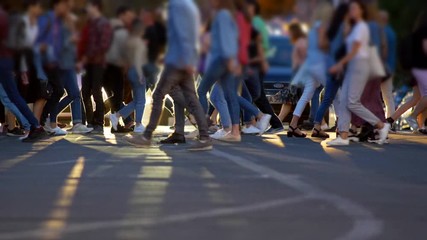 People crowd crossing street in front of stopped cars. Slow motion shot