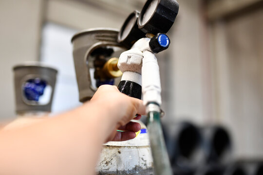 man's hand regulating the oxygen input of a pressure bottle for welding or cutting with a torch