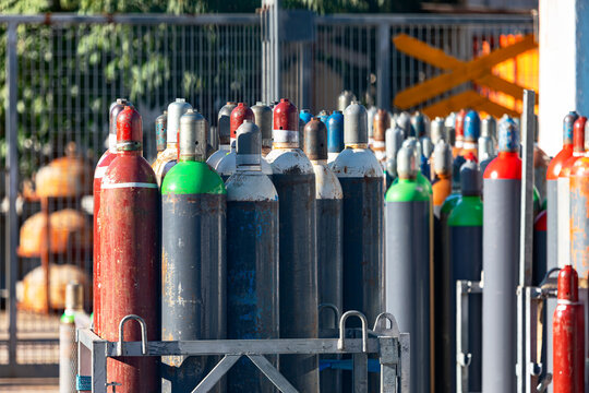 Multi-colored and different-sized gas cylinders on the street.  Bottles with liquefied petroleum gas (LPG), Propane-butane for home use. Jimbaran, Bali.