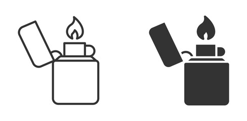 Lighter icon set in outline and silhouette style, representing fire, ignition, smoking accessories, and everyday tools, vector illustration.