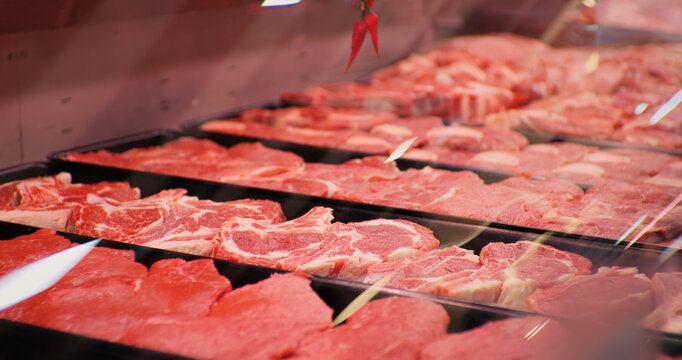 Large selection of fresh raw meat cuts in butchers shop. Freshly cut meat hunks for sale in supermarket.