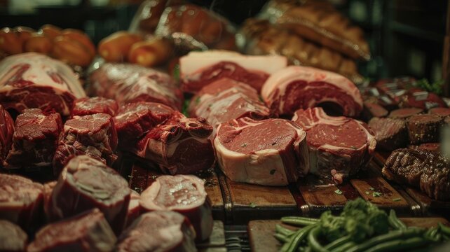 Assortment of fresh cuts of meat at a butcher shop display,carnivore diet,
