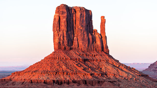 Panoramic view of mittens butte mesa with vibrant colorful red orange rock color on horizon in Monument Valley canyons during sunset in Arizona