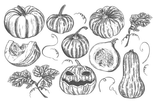 Hand drawn ink pumpkin, butternut squash vegetable sketches set. Food drawings for labels and packaging. Vegetarian menu. Healthy diet.