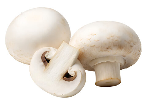 A group of five white button mushrooms clustered together on a plain white surface in a studio shot isolated on white background
