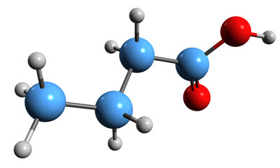 3D image of Butyric acid skeletal formula - molecular chemical structure of  butanoic acid isolated on white background
