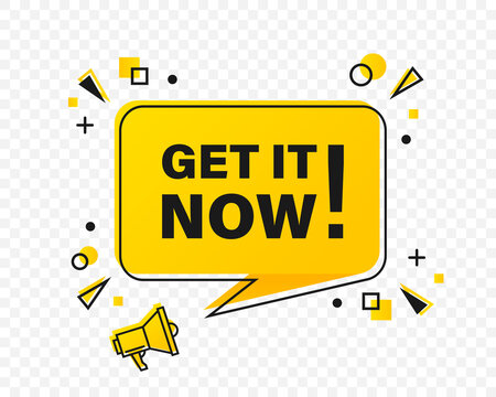 Get It Now vector abstract banner with speech bubble and megaphone in yellow and black colors. Vector illustration EPS 10