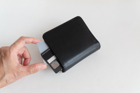 Hand choose credit card inside black wallet on white desk for financial, Buy now pay later, cashless, payday concept