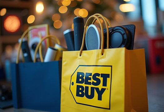 Close-Up of a Best Buy Shopping Bag with Electronics and Tech Gadgets Symbolizing Holiday Shopping and Excitement for New Purchases