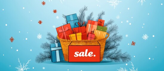 Grocery basket filled with colorful gifts and a sale sign against a winter background representing seasonal discounts and online shopping