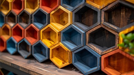 colorful hexagon honeycomb shelves interior design pattern, Honeycomb Hexagon Hive with Bees on Blue Background, Honeycomb-inspired interior wall shelf design for modern homes