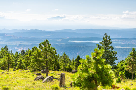View of canyon landscape on highway 12 scenic road byway in Grand Staircase Escalante National Monument, Utah with pine trees forest