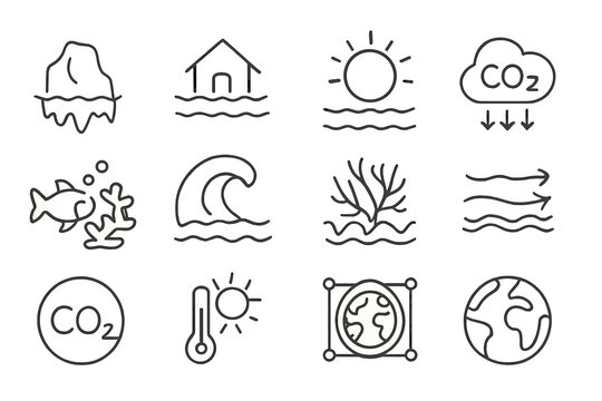 Climate Change Icons. Outline icon set of climate change and oceans: melting ice, rising sea level, warming