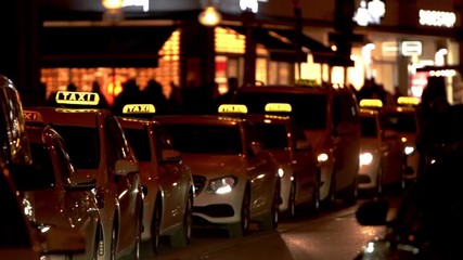 Row of taxi. Night transportation in urban city. Illuminated scene after dark. Downtown munich taxi cars to transport tourist. Slow motion movement