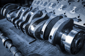 Engine with gearbox system disassembly and repair process, highlighting parts and machinery in a bright modern setting, symbolizing technical precision and mechanical work