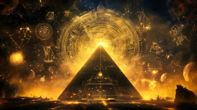 An esoteric pyramid under a starry night sky. Hermetic and ancient wisdom concept.