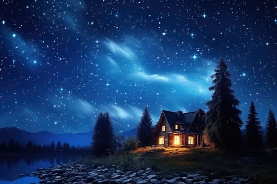 a serene cabin nestled in a moonlit forest