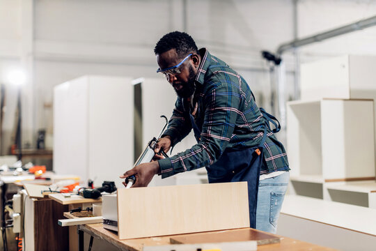 Carpenter working on woodworking machines in carpentry shop. Carpenter working to making wood furniture in wood workshop