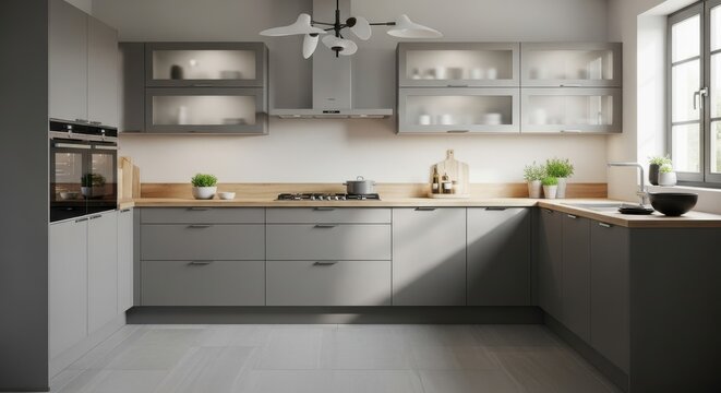 Modern grey kitchen with sleek cabinetry and natural light