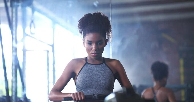 Motivated elderly woman working out back muscles on rowing machine in gym, showing active lifestyle, healthy aging, and strength after retirement